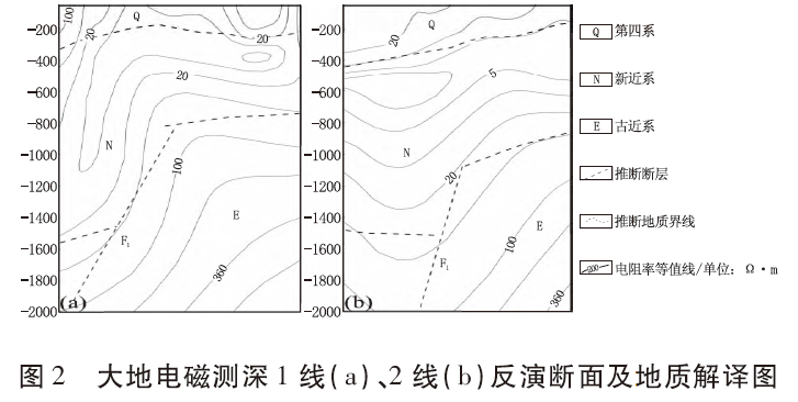 勘查區內主要斷裂構造均為區域性斷裂的次生斷裂,主要有NNE向張完集斷裂F1和EW 向的渦河斷裂F推1(圖1)。前人在區內布設有兩條大地電磁測深平行剖面(1線、2線),通過明顯的“V”型寬大低阻異常和同步向下彎曲典型斷裂異常特征,于區內東側邊界解譯推斷了走向約40°、NWW 傾的張完集斷裂F1(圖2)。渦河斷裂F推1位于勘查區南側亞珠石油城—化肥廠一線,該斷裂為亳州隆起的北界斷裂,其主要通過重力資料推測為EW 走向、N傾的正斷層。