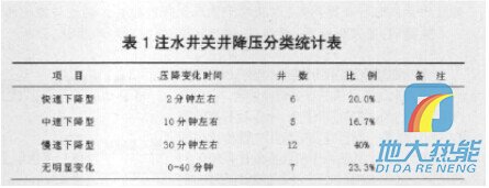 為確定合理降壓時間,在我隊30口注水井洗井過程中觀察注水井壓力隨關井時間的變化,以短時間(60分鐘)壓力出現(xiàn)直線段或相對直線段統(tǒng)計,歸納總結如表1所示的幾種類型:快速下降型、中速下降型、慢速下降型、無明顯變化型。 根據(jù)調(diào)查統(tǒng)計結果,來確定不同類型的關井降壓時間:快速下降型的井只需關井3 ̄5分鐘;中速下降型的注水井需關井10 ̄15分鐘;慢速下降型的注水井需關井降壓30分鐘,無明顯變化型的注水井可直接洗井(洗井時應觀察壓降的變化)。為此關井降壓的最佳時間應該是壓降變化趨于穩(wěn)定的時間,較為合理。