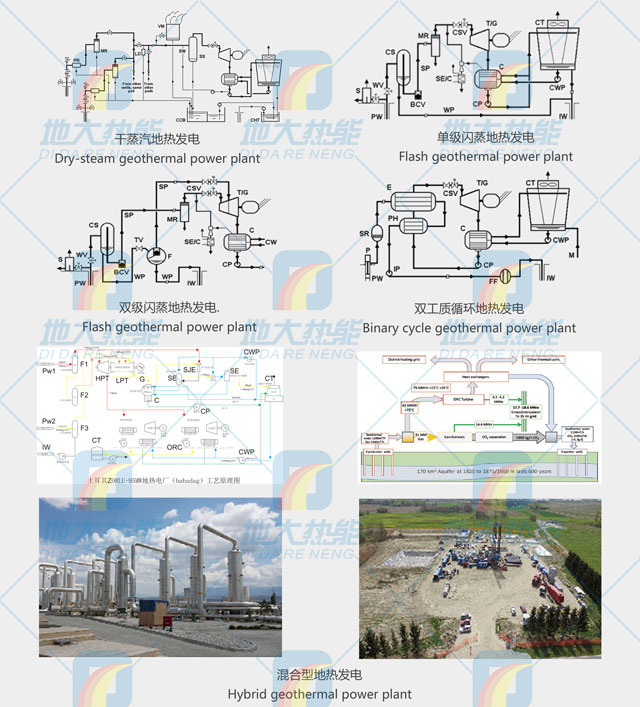 地熱發(fā)電需根據(jù)地熱流體的溫度、壓力以及它們的水、汽品質(zhì)的不同而采取不同的設(shè)計方案。其主要類型包括:干蒸汽地熱發(fā)電、單級閃蒸地熱發(fā)電、雙級閃蒸地熱發(fā)電、一井一站地熱發(fā)電、混合型地熱發(fā)電、雙工質(zhì)循環(huán)地熱發(fā)電、干熱巖發(fā)電。
