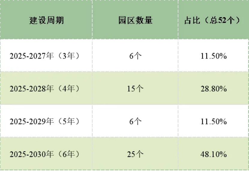 僅6個園區采用3年短周期(2025-2027年),多為產業結構相對優化、可再生能源資源較好的園區(如沈陽中德高端裝備制造產業園、內蒙古包頭稀土高新技術產業開發區),承擔快速試點、經驗復制的功能,為長周期園區提供示范。