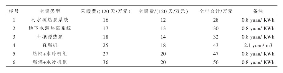 從上述表格可以明顯地看出來,污水源熱泵系統(tǒng)有良好的經(jīng)濟效益,與地下水源熱泵、直燃機、熱網(wǎng)+水冷機組、燃煤+水冷機組等系統(tǒng)相比,該系統(tǒng)經(jīng)濟優(yōu)勢十分明顯。